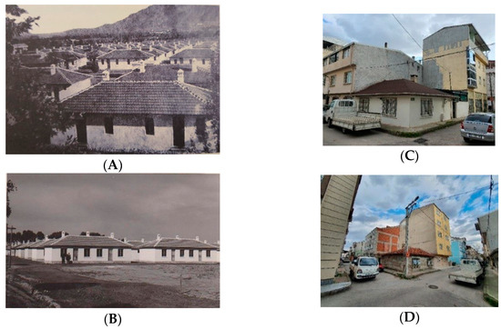 (A,B) The first immigrant housing units that were built in the Hürriyet Neighborhood for immigrants from Bulgaria in the 1950s. (A) [38]. (B) Source: Kerim Bayramoğlu archive. (C,D) Some of the immigrant houses that have survived to this day (Source: the first author from field survey, 2021).