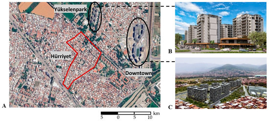 (A) Aerial image (Google Earth: 40°13′13″ N 29°00′07″ E; accessed on 30 November 2023). (B) The 3D-rendering image of the project in the Adalet Neighborhood-Yükselenpark Hürriyet (Akyükselen İnşaat, accessed on 22 June 2022 https://www.akyukseleninsaat.com.tr/hurriyet.php) [40]. (C) The 3D-rendering image of the relationship between the project in the İstiklal Neighborhood, Downtown Bursa, and the city scale (Atış Yapı, accessed on 22 June 2022 https://www.atisyapi.com.tr/project/downtown-bursa/) [41].