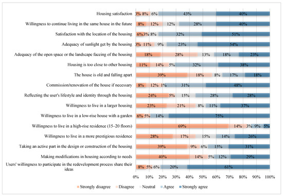 Users are satisfied with their housing (83%) and want to live in the same housing in the future. More than half of the users think that their housing reflects their lifestyle (56%). Almost half of the users want to live in a larger housing unit (48%). The percentage of those who want to live in low-rise housing with a garden is high (89%). However, the percentage of those who express that they want to live in higher-rise (15–20 floors) housing is relatively small (14%), while the percentage of those who want to live in more prestigious housing is remarkable (40%). Almost half of the users have taken part in the design or construction of their home (46%) and have made changes to their home in line with their needs (41%). If housing is to be reproduced, the percentage of those who want to participate in the process and present their ideas is quite high (81%) (Figure 6).