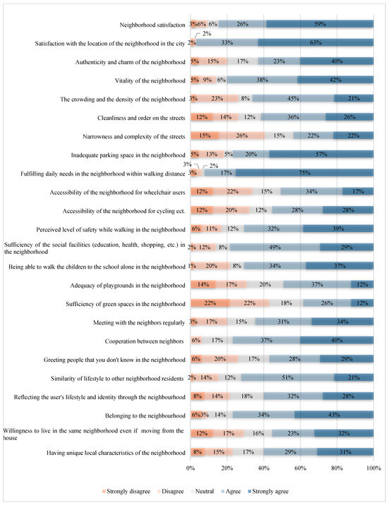 Most of the users surveyed are satisfied with the neighborhood they live in (85%). The location of the neighborhood is quite advantageous in the city (96%). The neighborhood is considered to be authentic and attractive (63%) and, at the same time, lively (80%). It is stated that there is a parking problem (77%). Within walking distance of the neighborhood, daily needs are met (92%), and social facilities (education, health, shopping, religious facilities, etc.) are found to be partially sufficient (78%). Users stated that they meet their neighbors regularly (65%), help their neighbors (77%), and greet people they do not know (57%). Users think that their lifestyle is similar to that of the residents of the neighborhood (73%) and reflects themselves in terms of identity and culture (60%). The majority of users feel that they belong to the neighborhood (77%), and more than half of them want to live in the same neighborhood even if they move out of the housing they live in (55%). More than half of the users think the neighborhood has unique local characteristics (60%) (Figure 7).