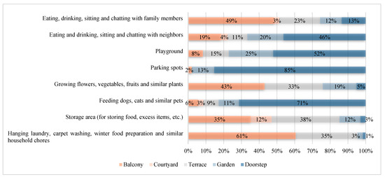 Figure 8 shows the purposes for which users utilize the open and common spaces in residence. It is worth noting that the use of the doorstep area is very common. The doorstep is mainly used for parking, children’s playground, eating and drinking, sitting, and chatting with neighbors. Other open and communal spaces are used quite widely for various purposes.