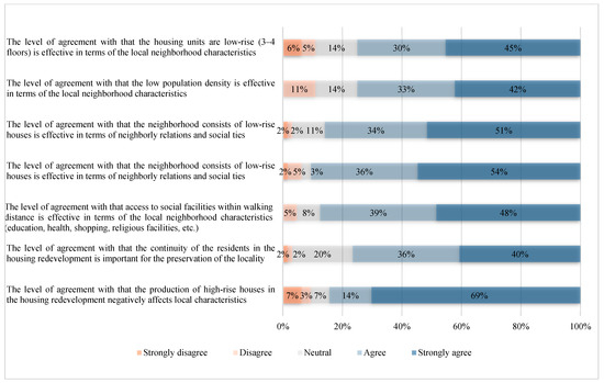 Figure 9 shows that the respondents to the questionnaire have stated that the low number of floors (75%) of the houses in the Hürriyet Neighborhood, the low population density (75%), and the fact that the residents have been living there for a long time (85%) are the main aspects that affect the local character of the neighborhood. In addition, it is observed that the fact that the neighborhood consists of low-rise residential buildings is effective in the formation of neighborhood relations and social ties (90%). This result was associated with the low density and the scale of the residential buildings. It is stated that transportation to social facilities (education, health, shopping, religious facilities, etc.) within walking distance is effective in the formation of the local characteristics of the neighborhood (87%). It is seen that the accessibility and reachability at the horizontal scale in the neighborhood support the liveliness and have an effect on the neighborhood character. Furthermore, it is stated that the continuity of the neighborhood’s residents has an essential role in the continuity of the locality (76%). A large portion of the users think that the production of high-rise residential buildings in the housing redevelopment process will have negative effects on the local characteristics (83%).