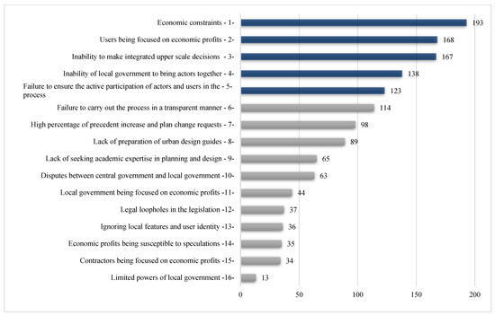 In the priorities section, the first thing expected from expert participants was to rank the causes of the problems encountered in housing redevelopment according to their priorities (Figure 10).