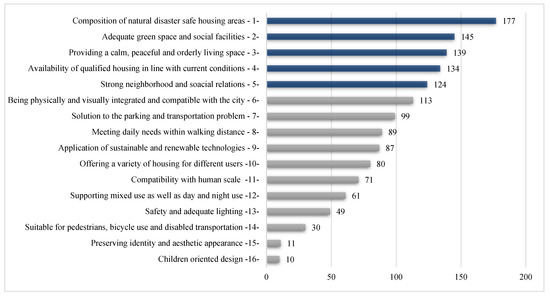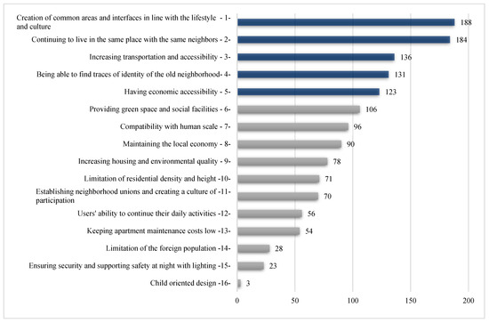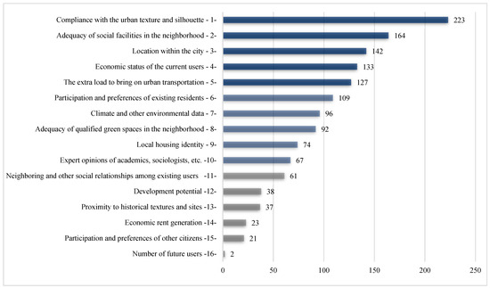 Fourthly, the expert participants were asked to rank the criteria that should be taken into account in creating a strategic approach for determining the scale (physical–social–economic) of housing redevelopment in terms of priorities when developing (Figure 16).