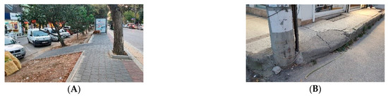 (A,B) Examples of roads and floors that are not suitable for the use of baby strollers, wheelchairs, and bicycles (Source: the first author from field survey, 2021).
