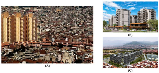 (A) The relationship between Bursa Doğanbey TOKİ urban transformation project and the city scale (Photo by Gürsel Egemen Ergin in 2014, accessed on 22 June 2022, https://www.milliyet.com.tr/galeri/tokinin-bursaya-tokadi-1468516/2). (B) The 3D-rendering image of the project in the Adalet Neighborhood, Yükselenpark Hürriyet (Akyükselen İnşaat, accessed on 22 June 2022, https://www.akyukseleninsaat.com.tr/hurriyet.php). (C) The 3D-rendering image of the relationship between the project in the İstiklal Neighborhood, Downtown Bursa, and the city scale (Atış Yapı, accessed on 22 June 2022, https://www.atisyapi.com.tr/project/downtown-bursa/).