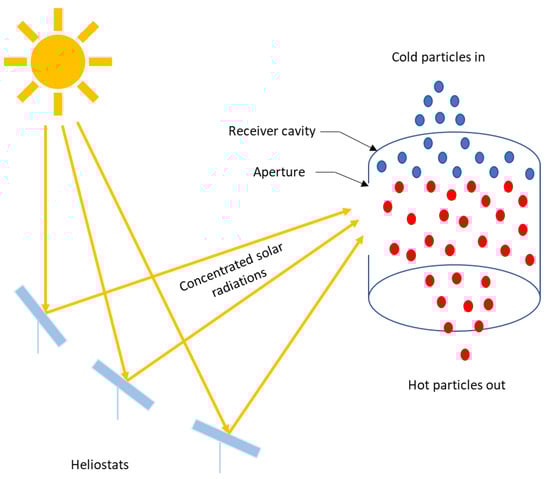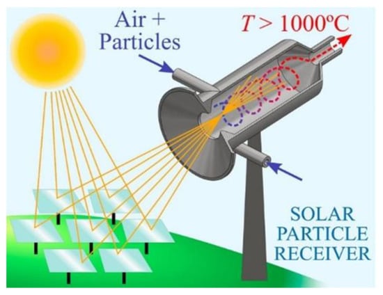 Several developments and research works are underway to develop CST technologies to overcome the above-mentioned issues and effectively replace the use of fossil fuels in different high-temperature applications. One advancement towards achieving the CST development goal is the use of solid particle-based solar receivers, in which ceramic particles, alone or within a vortex of air, are used as heat transfer fluid [70]. These receivers have the potential to achieve a temperature above 1000 °C as particles come into direct contact with the solar radiations, and there is no extra resistance from tubing for heat transfer [71,72]. Furthermore, the materials used for these receivers are more stable and less expensive relative to molten salts [73]. Much work related to particle-laden receivers exists in the literature, including the design of the receiver, mathematical modeling, and the testing of pilot plants [23,24,49].