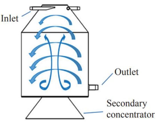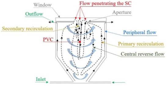 To overcome the drawbacks associated with the SVR, Chinnici et al. [29,115,116] presented a new configuration of a cylindrical cavity receiver known as the solar expanding-vortex receiver (SEVR), which is shown in Figure 9. This novel configuration has a modified geometry, with the introduction of a conical section. The particles and air exit in the direction that is radial to the axis of the receiver cavity. The residence time is dependent on the particle size in this new configuration, which helps to achieve a uniform outlet temperature. This configuration is also helpful for avoiding the deposition of particles onto the aperture window. The authors evaluated the effect of receiver geometry on the particle trajectories and residence times using a CFD model [29]. Furthermore, a particle’s deposition onto the aperture window was also assessed both experimentally and numerically [115]. It was found that for a fixed aperture size, an increase in the cone angle is favorable as it generates a larger vortex at the aperture plane. This is why a larger cone angle is favorable for smaller size particles, as it will lower the particle flowing toward the aperture. The optimum value of the cone angle was predicted to be 40° for the studied conditions. Chinnici et al. [115,116] further confirmed that a well-established vortex flow inside the cavity is generated via the SEVR. It was also found that a reversed flow formed in the vortex core region, whereas at the inlet and outlet regions of the cavity, a processing vortex core (PVC) structure was observed, as shown in Figure 10 [116].