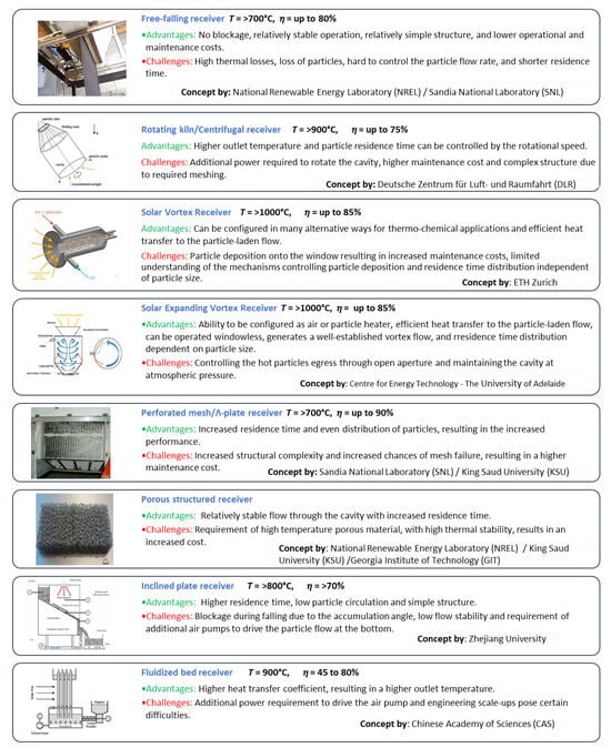 A summary of the advantages and challenges associated with the different particle-laden solar receiver technologies reported in the literature. Here, T and η refer to the maximum reported value of output temperature and thermal efficiency, respectively.