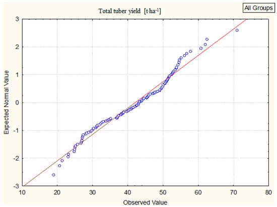 So, in this case, the alignment of the total tuber yield values along a straight line in the plot suggests that the distribution of these values is close to a normal distribution, which is a positive indicator for statistical analysis and interpretation.