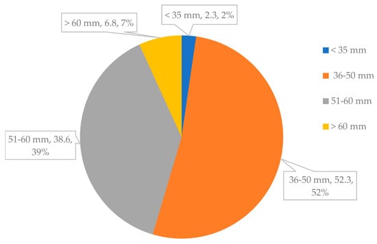 The majority of the potato yield comprised tubers with a diameter ranging from 36 to 50 mm (52.3%), whereas the smallest proportion was attributed to tubers with a diameter less than 35 mm (2.3%) (Figure 3).