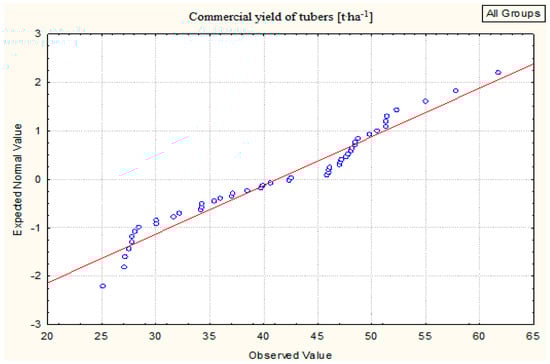 The total tuber yield values in Figure 2 appear to follow a normal distribution, indicated by their alignment along a straight line. This adherence to a normal distribution instills a high level of confidence in the obtained results, suggesting minimal deviations or variations in the distribution of the analyzed variables.