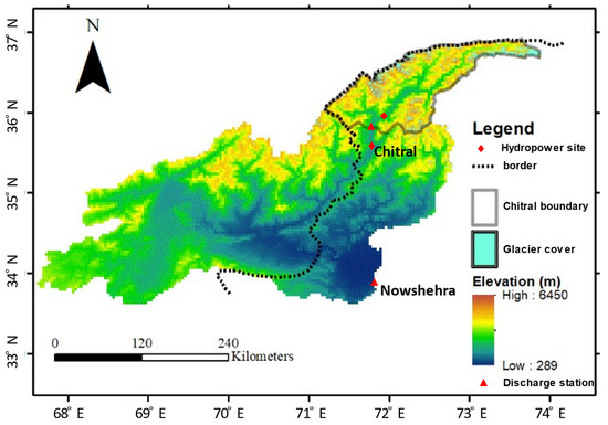 The Kabul River’s total length is 700 km, of which 560 km is located in Afghanistan [13]. River flows are being measured at two locations (Figure 1) by the Water and Power Development Authority (WAPDA), namely, at Chitral (upstream), after which the river enters Afghanistan, and at Nowshera (downstream), which is before the confluence to the Indus River. At Nowshera, the hydrograph starts rising in March and reaches the maximum in July. Instead, it rises in April at Chitral because of generally colder climatic conditions at higher altitudes. Chitral annually drains 288 m3s−1 discharge downstream, which becomes around 608 m3s−1 before entering Pakistan and around 800 m3s−1 at Nowshera [18]. The main source of these flows is the meltwater from snow and glaciers that start contributing to the onset of the melting season in spring [13,17]. The glaciers cover an area of 1650 km2, which mostly lies in the northeastern subbasin of Chitral [19].