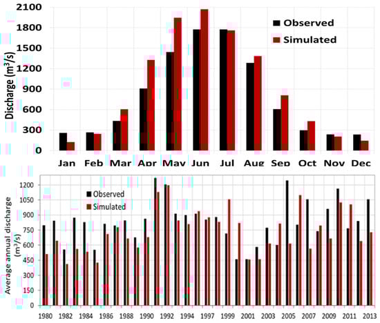 The RRI model is calibrated for the 17 years from 1980 to 1996 and validated for 17 years from 1997 to 2013. The comparison of monthly average river flows from 1980–2013 shows some inaccuracies in the simulations. The spring flows are overestimated, particularly in April and May. However, average annual river flows are fairly simulated, as shown in Figure 2. The model assumes that precipitation below 0 °C is snow and the rest is rain, which has caused some inconsistencies in the spring river flow simulations. Moreover, the coarse resolution of the APHRODITE is not an ideal choice for the basin, which has steep slopes and high altitudes. The performance is judged against some statistical parameters like R2, Root mean square, PBIAS, and volumetric difference. The indexes reveal the overestimation in the simulated discharges, which can be improved by undertaking measures like finer resolution climate data and improved physical modeling [31] (Table 1).