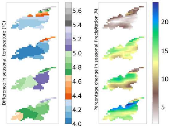 The future climate will see significant changes, which will likely impact the hydrologic cycle in space and time. The average annual temperature will increase by 4.7 °C in the future, while summer and winter will observe a higher increase than spring (Figure S2). From October to March, the mountainous northern regions will experience temperature increases between 5–5.6 °C (Figure 4). An important aspect of warming is that the northern mountainous region will grow warmer at a higher rate than low-elevation zones. However, in June–August, the downstream regions will become warmer than the mountainous zones (Figure 4).
