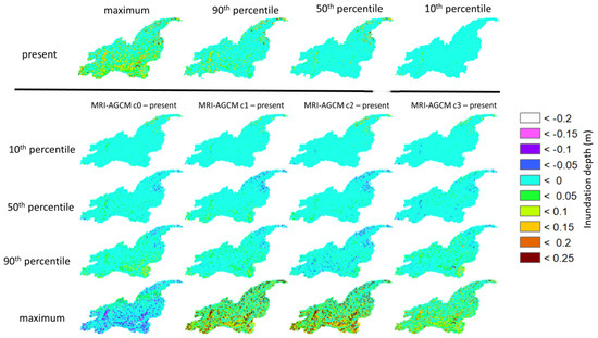 The top panel shows the present inundation depths for different percentiles. The bottom one shows change for each of the four scenarios of MRI-AGCM relative to the present climate for different percentiles.