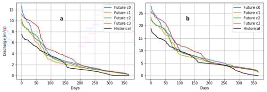 The flow duration curves of the (a) Ayun and (b) Kedam for the present and future.