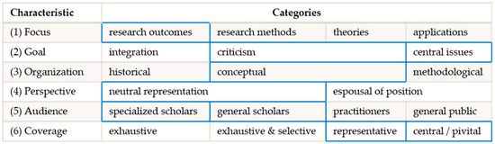 - Cooper, H.M. Organizing knowledge syntheses: A taxonomy of literature reviews. Knowl. Soc. 1988, 1, 104. [Google Scholar] [CrossRef]