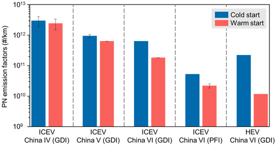 In contrast, the disparity in PN emissions during cold and warm starts is most pronounced in the China VI hybrid vehicles. The PN emissions under cold start for China VI hybrid vehicle are 19.2 times higher than those under warm start. Perhaps the findings from the study by Zhai et al. [30] could provide an explanation for the significant difference in PN emissions between cold and warm starts in hybrid vehicles. They observed that during cold start, hybrid vehicles require a longer engine warmup time compared to gasoline vehicles. However, during warm starts, there is no need for the engine startup phase.