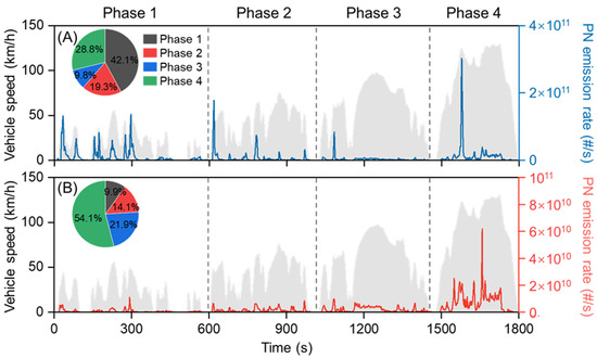 Instantaneous PN emission rate and vehicle speed for China VI ICEV with GDI engines at cold-start (A) and warm-start (B) stages. The pie charts represent the distribution of cumulative emissions for the four speed phases in the entire WLTC.