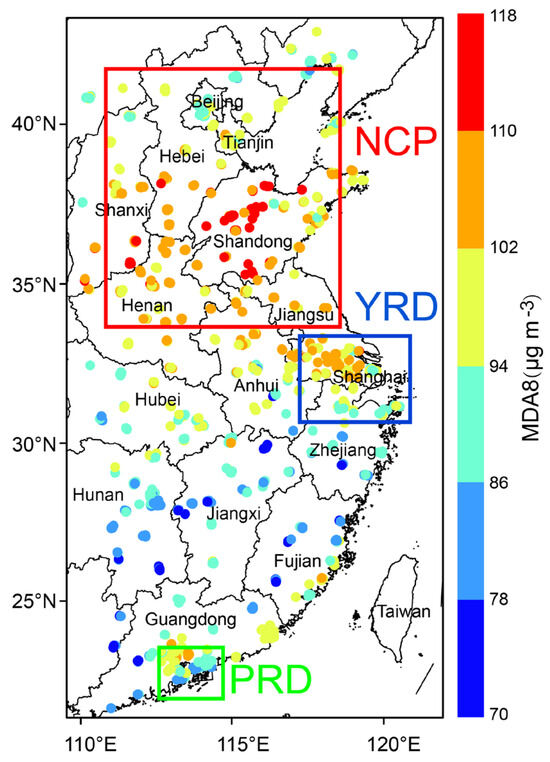 Spatial distribution of averaged daily MDA8 at 447 ground-based sites in East China during 2019–2021. The specific location of each province, the NCP, the YRD, and the PRD, are labeled on the map.