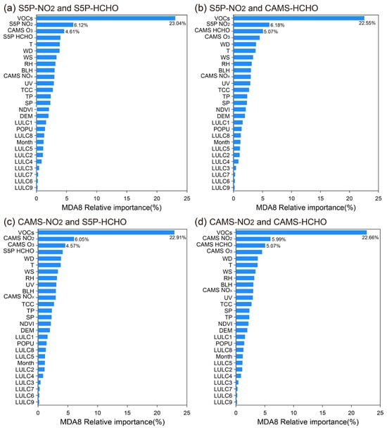The relative importance of explanatory variables for surface ozone is depicted in Figure 5. In these four surface ozone estimation models, VOCs were found to be the dominant factor, with the relative importance values larger than 22.55% for the MDA8 concentration in East China. This result indicates that the ambient ozone concentration is obviously modulated by VOCs. Combining the results of the four O3 estimation models, it revealed that the two largest contributors to these six VOCs (including C3H8, C5H8, CH4, H2O2, OH, and PAN) were C3H8 and H2O2, which contributed about 4.12% and 4.06%, respectively, and the remaining four VOCs including C5H8, OH, PAN, and CH4, contributed 4.02%, 3.79%, 3.55%, and 3.49%, respectively. Subsequently, the relative importance of NO2 (S5P NO2 or CAMS NO2) was larger than 6% in these four models, and the relative importance of CAMS NOX was about 2.97% in these four models, and it was revealed that the NOX (including NO2) was the second principal variable for the surface ozone in East China. CAMS-NOX is emission inventory data of anthropogenic emissions, while S5P-NO2 is satellite-based observations, and the combination of these two types of data contains NOX information from different sources, which can better estimate the surface O3. In addition to VOCs and NOX, HCHO (including S5P HCHO and CAMS HCHO) was found to be the third or fourth primary factor for the surface ozone with a relative importance larger than 4%, and this reemphasized the important contribution of VOCs to surface ozone. CAMS O3 was revealed to be the third or fourth dominant factor for the surface ozone in East China, with a relative importance larger than 4.51%.