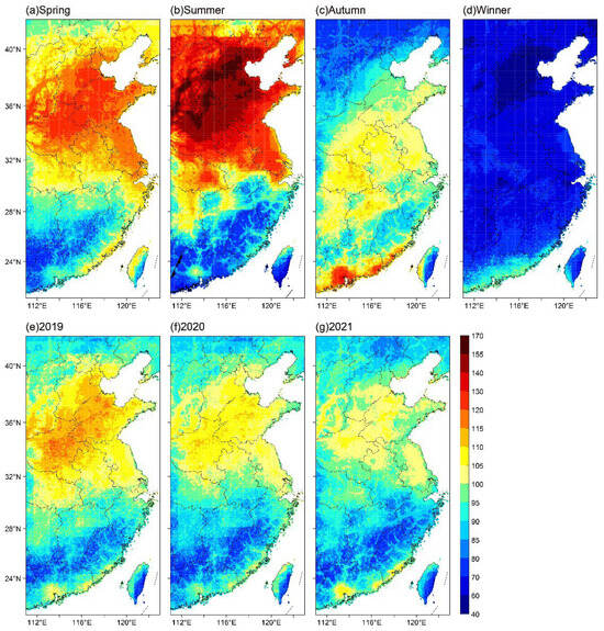 In terms of the spatial patterns of the seasonal MDA8, the most serious ozone pollution (>115 µg m−3) was found in North China in summer. This major ozone pollution region included Beijing–Tianjin–Hebei, Shandong Province, Henan Province, Shanxi Province, the southern part of Liaoning Province, the eastern part of Hubei Province, and the northern part of the Anhui and Jiangsu provinces. Although the spatial coverage of ozone pollution in spring is similar to that in summer, the ozone pollution level in North China in spring is lower than that in summer. The most serious ozone pollution in autumn is mainly concentrated in the PRD and the coastal area of the border area between Guangdong Province and Fujian Province; although its regional scope is much smaller than that of the NCP, its ozone pollution level is similar to that of the NCP in summer. Among the four seasons, the season with the most serious ozone pollution is summer, and the lightest ozone pollution level occurs in winter. The spatial distribution of seasonally averaged MDA8 in East China is consistent with the results of previous studies, which may be related to the spatial distribution of ozone precursor emissions (VOCs and NOX), temperature, and UV radiation [21,22,38,47].