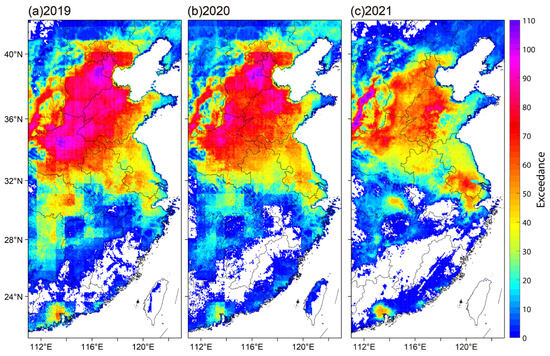 The annual accumulated exceedance counts of estimated MDA8 for each pixel over East China during 2019 and 2021. The exceedance was counted once when the MDA8 value of a specific pixel in one day was larger than 160 µg m−3.