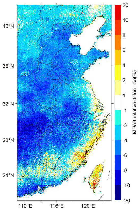 The spatial distribution of MDA8 relative difference between 2020 and 2019.