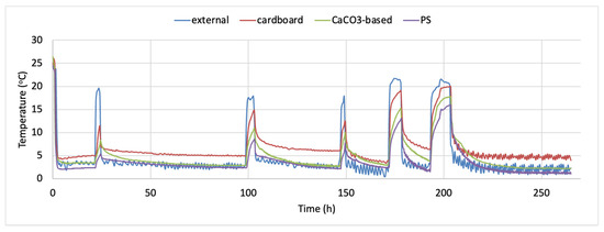 The thermal conductivity and thermal resistivity of the tested packaging materials are presented in Table 1. Thermal resistivity was higher for the PS, followed by the CaCO3-based and the cardboard boxes. The thermal conductivity value for the tested PS was in agreement with the respective values reported by Harvey (1997), while the CaCO3-based material also exhibited thermal conductivity within the limits 0.036–0.048 W/m°C reported for the main air-based insulations, such as fiberglass, cellulose and expanded PS, indicating that the tested CaCO3-based containers may serve as insulating cool boxes for perishable products [23]. Monisha et al. (2022), studied the incorporation of CaCO3 derived from aquatic sources in cement mortar and reported that it led to thermal insulation behavior. They also reported that compared to other substitution components that can be found in cement and concrete, CaCO3 from marine wastes has retained great thermal resistivity [24]. Similar results were reported by Liu et al. (2020), in their study regarding the thermal properties of environmentally friendly brick made from oyster shells and sorghum waste, which contain about 95% CaCO3. By increasing the oyster shell percentage from 15% to 40%, the thermal conductivity coefficient K-value of the brick decreased from 0.188 to 0.083 W/mK, thus offering better thermal insulation [25]. The thermal conductivity of cardboard was determined as 0.05 W/m°C, which is within the range 0.05–0.12 W/m°C reported for cardboard, depending on the internal structure [26]. Asdrubali et al. (2015), also estimated the thermal conductivity of cardboard-based panels to be around 0.055 W/m°C [27].