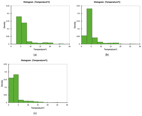 The time–temperature conditions inside each one of the tested containers and externally, during the 11 days storage test for whole red sea bream, is presented in Figure 1. The density plots indicating the proportion of the temperature values observed inside the tested containers during the simulated fish transportation and storage are presented in Figure 2a–c. It is evident that temperature inside the cardboard boxes remained higher during the temperature fluctuations (mean temperature was 6.687 ± 3.629 °C during the 11 days of non-isothermal storage test, while the respective mean temperatures for the CaCO3-based boxes and the conventional PS containers was 4.728 ± 3.363 and 3.738 ± 3.058 °C, respectively). The minimum and maximum temperature during the temperature fluctuations inside the cardboard container was 3.4 and 26.0 °C, respectively, while the respective minimum and maximum temperature for the CaCO3-based boxes and the conventional PS containers were 2.2 and 26.4 °C and 1.1 and 24.4 °C. This finding is in compliance with the reported results of Leducq et al. (2015). They compared the performance of three materials—a phase change material (PCM), carton board and polystyrene- in terms of thermal diffusivity with the aim of using them as an additional packaging for ice cream. They observed that as the ambient air temperature varied from −21.1 °C to −22.6 °C the amplitude of the temperature inside the carton board was 0.5 °C while in both EPS and PCM was 0.2 °C. That implies the lower thermal insulation of carton materials [28]. None of the histograms is symmetric, while all Figure 2a–c are right skewed. Skewness was determined as 2.758, 2.800 and 3.129, indicating that in the case of the PS boxes, more temperature values are observed on the left side of the graph (corresponding to lower temperatures inside the box). The lowest skewness value was observed for the cardboard boxes.
