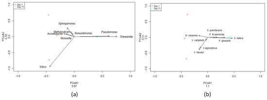 Two-Dimensional PCoA plot of most abundant bacterial genera (a) and species (b) on Day 1 and Day 11. PCoA1, first principal component; PCoA2, second principal component. Small dots (three red and three cyan) indicate samples from the 16S rRNA Sequencing Data. Each point represents a sample based on microbial composition, with distances reflecting dissimilarities. Clustering reveals distinct community patterns, offering insights into the diversity and relationships within the analyzed samples. (V. harveyi → Vibrio harveyi, V. alginolyticus → Vibrio alginolyticus, S. baltica → Shewanella baltica, P. gessardii → Pseudomonas gessardii, M. osloensis → Moraxella osloensis, P. ficuserectae → Pseudomonas ficuserectae, S. putrefaciens → Shewanella putrefaciens, V. campbellii → Vibrio campbellii).