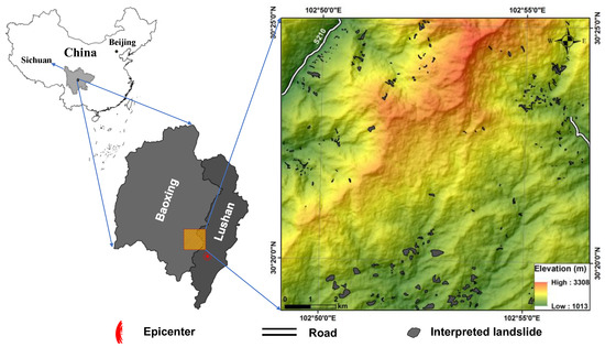 There have been 17 earthquakes with magnitudes ≥ 4.7 in the history of the Lushan earthquake zone [38]. Strong tectonic activity provides favorable conditions that make the region prone to landslides. The 2013 Lushan earthquake has triggered thousands of landslides [39]. An inventory of 308 coseismic landslides was compiled by making comparisons between pre-earthquake satellite images and post-earthquake aerial photographs in the study area. The cumulative area of these interpreted landslides spans 5 km2.