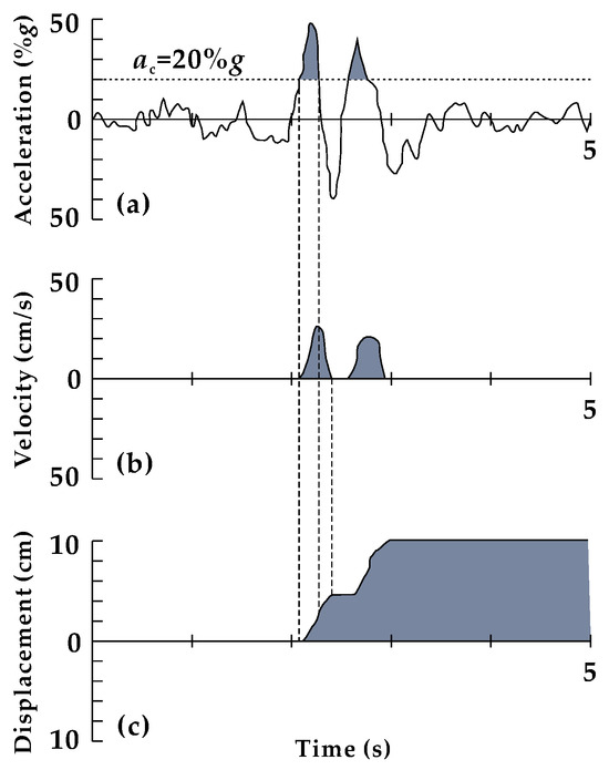 Once an acceleration–time history has been selected, segments of the record surpassing the critical acceleration (Figure 4a) are integrated once to establish a velocity profile (Figure 4b). Subsequently, the velocity–time history undergoes a second integration to yield the cumulative displacement of the block (Figure 4c) [18,19,31].