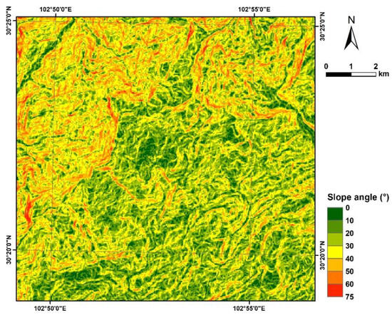 We selected a 30 m DEM to produce a slope map (Figure 6) by applying a basic slope algorithm, where the slope was identified as the steepest downhill descent among adjacent cells [48]. The derived slopes ranged from 0° to 75°. The northwestern and northeastern portions of the study area are high mountains and deeply incised valleys with slopes greater than 50°, and the central and southeastern parts of the area are relatively flat (Figure 6).