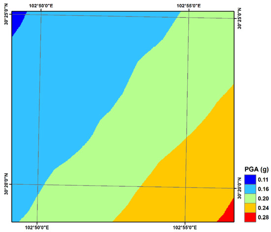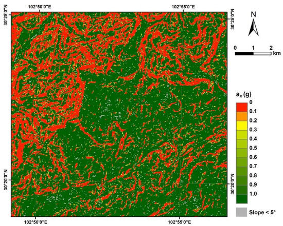 After the adjustment of the static factors of safety, we produced a map of critical acceleration using Equation (1) to integrate the slope angle with the static factors of safety (Figure 9). The critical acceleration represents the intrinsic properties of slopes independent of any shaking scenario; thus, the critical acceleration map serves as an indicator of coseismic landslide susceptibility [18,19]. A smaller value of critical acceleration denotes the lower intensity of shaking needed to overcome the stability of the slope. Therefore, coseismic sliding is more likely to develop on the slope. Figure 9 shows that the dynamically unstable slopes with a critical acceleration of less than 0.3 g are mainly distributed in the northwestern part of the study area, and only a small portion is present in the southern part of the study area.