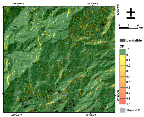 The Newmark displacement cells, each 1 cm, were grouped into bins. All cells with displacements between 0 cm and 1 cm were grouped into the first bin, those between 1 cm and 2 cm into the second bin, and so forth [18,19]. We grouped the predicted displacements into 75 bins. For each bin, we calculated the proportion of cells occupied by landslide areas. This proportion represents the posterior probability of the bin according to Equation (6). The proportion of the entire landslide area within the entire study area was calculated to obtain the prior probability, which was the same in each bin. Using Equation (6), we computed the values of CF by combining the corresponding posterior and prior probabilities. The calculated CFs ranged from −1 to 0.99. The CFM provides a necessary linkage between the Newmark displacements and confidence levels of coseismic landslide occurrence in the study area. We produced a coseismic landslide hazard map for the ground-shaking scenario of the Lushan earthquake based on the values of CF, as shown in Figure 12. The inventory of landslides triggered by the Lushan earthquake illustrates the fit of the predicted confidence levels of coseismic landslides.