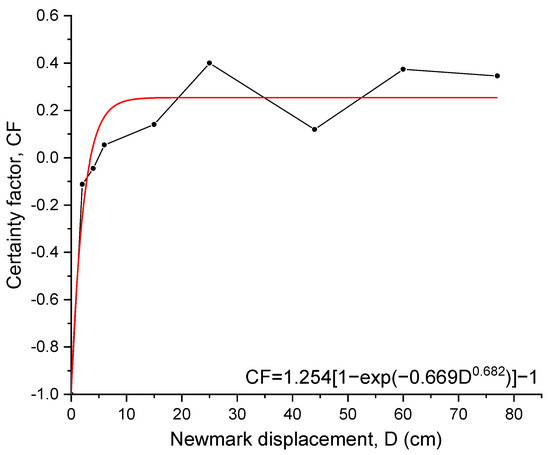 where CF is the certainty factor, represents the maximum CF value, stands for the predicted displacement, and and are the regression constants. The regression curve derived from the Lushan data is as follows: