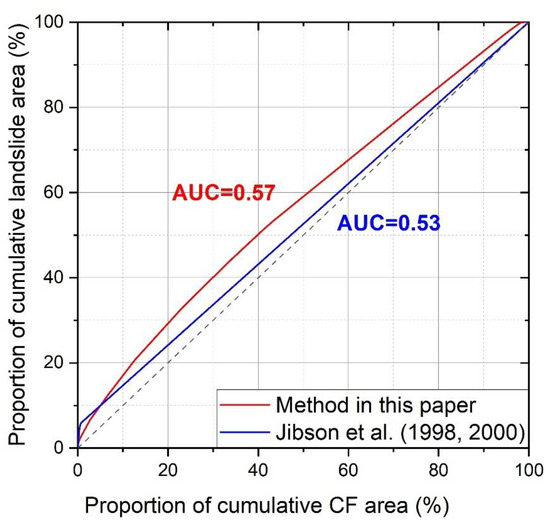 However, it is noteworthy that both methods yield relatively small AUC values. This outcome can be attributed to the coseismic landslide interpretation data employed in the analysis. As is well known, landslides can be categorized into three distinct areas: the source area, the transport area, and the deposition area. The interpretation data utilized for the calculations encompass all three areas. The initiation of landslides occurs in the source area, while the deposition area is where the landslide material comes to rest. The source area is typically characterized by steep slopes, leading to relatively large Newmark displacements that align with the model’s predictions. Conversely, the deposition area tends to exhibit flatter terrain with smaller slopes, resulting in relatively smaller Newmark displacements. Nevertheless, following the occurrence of a landslide, a substantial amount of material accumulates in the deposition area. Consequently, a significant portion of the landslide area in the interpretation data falls within regions associated with smaller Newmark displacements. This leads to deviations in the predictive outcomes of the model. To achieve more accurate results, it is crucial to precisely delineate the source area of coseismic landslides and employ it as the primary input for hazard assessment. This particular aspect demands significant attention in future evaluations of coseismic landslide hazards. Furthermore, since the proposed method concentrates on assessing the stability of unloading joints based on strength parameters like the joint roughness coefficient and joint wall compressive strength during predictions, its applicability is limited to spatial assessments of rock landslide hazards. The calibrated method proves most effective in predicting the spatial distribution of relatively shallow, disrupted slides and falls in rock and debris. However, it is likely to provide less precise predictions for the distribution of deeper, coherent landslides [18,19].