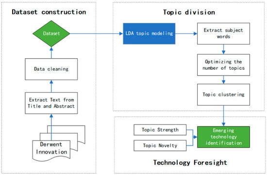 The LDA model is a probabilistic model for generating a corpus proposed by David M. Blei and others in 2003 [46]. It is one of the most commonly used text mining techniques [47,48]. LDA is entirely unsupervised [49,50,51] and does not require the input of reference data [52]. In contrast, supervised methods require semantic annotation, which aims to assign semantics to the statement [53]. Semantic annotations often need manual input [53,54]. They are time-consuming, expensive [55], and unavailable in many application scenarios. Furthermore, LDA provides an interpretable intermediate semantic representation of data in the form of topic graphs, thus leading to researchers making educated guesses and relying on initial information about the research domain [56]. Therefore, this paper uses a method based on the LDA model and integrates domain knowledge and expert group decision-making to conduct text mining of the hydrogen energy patent dataset, identify hydrogen energy technology topics, and conduct analyses of emerging technology. The research framework includes three modules: dataset construction, topic division, and technology foresight, as shwon in Figure 1.