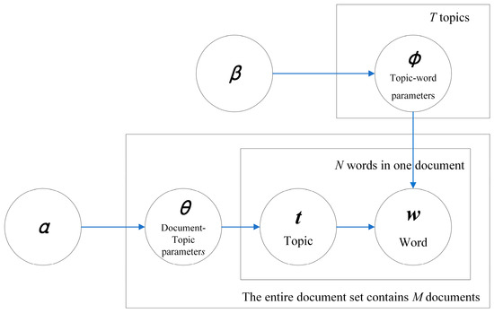 The latent polynomial variables in the LDA model are called topics [61,62]. The basic idea is to treat the document as a random mixture of latent topics, and the word distribution determines the characteristics of each topic [63,64]. The LDA model contains a three-level Bayesian structure that includes documents, topics, and words [65]. This structure describes the topic probability distributions of documents and then considers the topic probability distributions of words to perform topic clustering or text classification based on the topic distribution [64]. The LDA model believes that a mixture distribution of topics generates each document. Every word in each document belongs to a topic with a certain probability. The LDA model allows the generated document to contain multiple topics, and each word in the document is generated by one of the topics [46,64]. The probability model is shown in Figure 2. LDA assumes that the prior distribution of the document topic is the Dirichlet distribution. The Gibbs sampling algorithm is used to iterate M times to calculate the topic distribution of each document and the distribution of words in each topic.