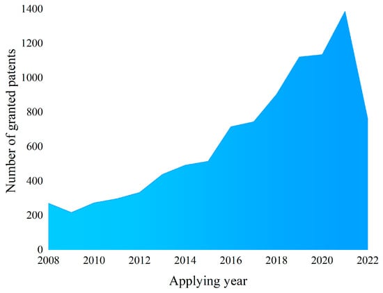 After performing patent searching via Derwent Innovation, 37,261 records and 27,907 DWPI patent families dating from 1 January 2008 to 31 December 2022 were obtained. The DWPI patent family has a strict definition in which one invention corresponds to a DWPI record and each DWPI patent family member is identical regarding its technical content. Hydrogen is widely used in human life. In the chemical industry, hydrogen has always been one of the primary raw materials used for synthesizing ammonia and methanol [73]. It is usually used in the refining of naphtha, gas, fuel, and petroleum via hydrogenation [12]. In the electronics industry, it is often used as a protective gas [74]. Hydrogen is fresh and environmentally friendly, making it suitable for use in the new field of green energy production [16,75]. This paper does not consider traditional hydrogen applications to ensure the study’s consistency and reliability. After removing irrelevant records, 9611 DWPI patent families were obtained. As shown in Figure 3, the number of granted patents in hydrogen-energy-related regions has increased yearly since 2009 according to application year. Since there is a specific period between patent application and formal authorization, the number of granted patents for 2022 is relatively small. Research and the practical use of hydrogen-related energy is becoming increasingly popular.