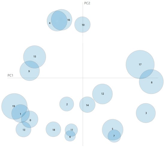 When cleaning the patent collection, it was considered that some words could be more descriptive of the topic in actual usage scenarios, and it is often necessary to associate the words to understand the topic’s broader meaning. Therefore, a list of binary and multivariate phrases commonly used in the field of hydrogen energy (such as fuel cell, and generation of hydrogen) was created by the expert group to form a bag-of-word model containing binary and multivariate phrases. The NLTK English stopword list was used, and standard stopwords (e.g., the) and context-specific words (e.g., comprising) that frequently appeared in patent texts were removed, as were words that frequently appeared but did not have a representative meaning (e.g., hydrogen); after multiple modeling and iteration stages were conducted, a special deactivation word list for the hydrogen energy field was established. Following text preprocessing, each patent’s title and abstract text were converted into a list of several words, which was used as the input of the LDA model. When carrying out topic modeling, the number of topics selected was 1–50. After 1000 iterations, it was concluded that the perplexity was relatively stable when the number of topics was 3–11 or 15–24. On this basis, the expert group had a meeting to consider the calculation results for different numbers of topics, believing that when the number of topics was 20, the technical topic clustering results were most consistent with the actual situation. The intertropical distance map [76,77] of the 20 topics is shown in Figure 4. The distances between different bubbles (they represent topics) reflect how similar the topics are to each other, and the overlap indicates the overlap between topics [78]. As shown in Figure 4, the distribution of the 20 topics is relatively even, and the number of documents included in each topic is pretty reasonable. At the same time, there is an inevitable overlap between the topics.