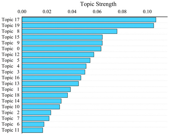 Based on the lengths of the application periods for hydrogen energy patents, starting from 2008, each year was taken as a time slice, and the sum of the intensity weights of all patents belonging to different topics in each year was calculated. According to the “document-topic” distribution, the probability that each document belongs to each topic is obtained, and the topic strength is then calculated. For the period extending from 2008 to 2022, the sums of the topic strengths of the 20 topics are sorted from strong to weak. The results are shown in Figure 4. Since 2008, Topic 17 has been the most robust topic, and the top ten topics include Topic 19, Topic 15, Topic 8, Topic 5, Topic 16, Topic 4, Topic 3, Topic 12, and Topic 9. These technical topics have received widespread attention from scholars and are of high research interest.