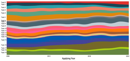 where St,j is the topic intensity of the jth topic in period t (the time unit is measured in years, for example, 2008), Mt is the total number of documents in period t, and is the probability of the ith document being assigned to the jth topic. As shown in Equation (1), the greater the topic intensity value, the more significant the proportion of the jth topic in the document set, and the more scholars pay attention to it. On this basis, a ThemeRiver chart of technology topics and a diagram of the evolutionary trends in technology topic strength were used to analyze the technical topic list further.