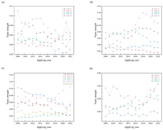 Evolutionary trends in topic strength in different technical fields: (a) hydrogen production methods; (b) hydrogen production materials and devices; (c) hydrogen storage and transportation; (d) hydrogen fuel cells and other hydrogen-energy-related equipment and systems.