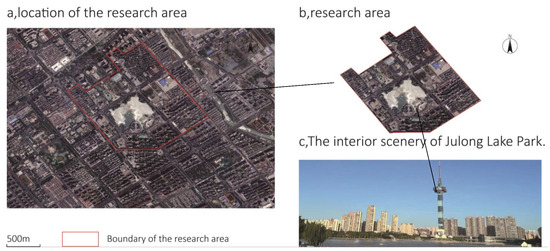 As shown in the Figure 1, the research area is located in the vicinity of Julong Lake Park in Yannan New District, Yancheng city, with geographical coordinates of 33°23′ N, 120°08′ E. The specific research scope covers an area of 2.11 square kilometers within the area surrounding Julong Lake Park, including the following eight residential areas: Ziyu Garden, Shuilv Mingyuan, Ruier Garden, Huaxia Green City, Longpowan, Fenghuanghui, Jinying International Garden, and Hongdu Garden.