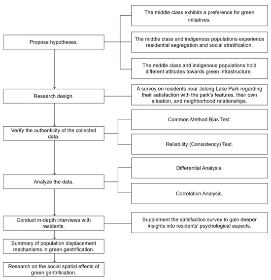 As shown in the Figure 4, in response to the existing gaps in the research on indigenous populations and new residents, the lack of data support for some qualitative conclusions, and unresolved issues, this paper outlines a survey to assess the satisfaction of indigenous populations and new residents with the attributes of Julong Lake Park, their individual circumstances, and neighborhood relationships. The three angles chosen for the investigation allow us to examine the satisfaction of residents with the attributes of Julong Lake Park and assess whether the configuration of green infrastructure caters to the middle class’s “green consumption” philosophy, potentially leading to the “indirect displacement” of indigenous populations while allowing the middle class to enjoy more green benefits.