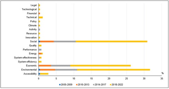 Environmental and social dimensions are present in all groups of years (2005–2009, 2010–2013, 2014–2017, and 2018–2022). The energy dimension was most frequent in studies between 2010–2013 and 2018–2022, and 9 of the 18 dimensions identified appeared only in studies of the years 2018–2022.