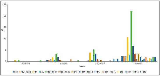 The sustainability index (FC4) and analyzes the urban region (FC6) focuses appeared in all groups of years. The focuses on the emission of gases (FC8) and application of different technologies (FC10) stand out in the 2018–2022 years for obtaining growth in the approach to studies near the main focuses of study. Finally, the focuses of study that appeared only in the years 2018–2022 were classification by type of transportation in relation to sustainability (FC9), focus on accessibility to public transportation (FC11), analyzes the coverage of the transportation network (FC12), more sustainable modes of transportation (FC13), sustainability composite indicator (FC16), and identifies the main studies on sustainable transportation (FC18). The analyzes the coverage of the transportation network (FC12) focus appeared the least in studies among all years.